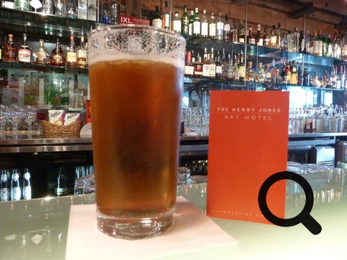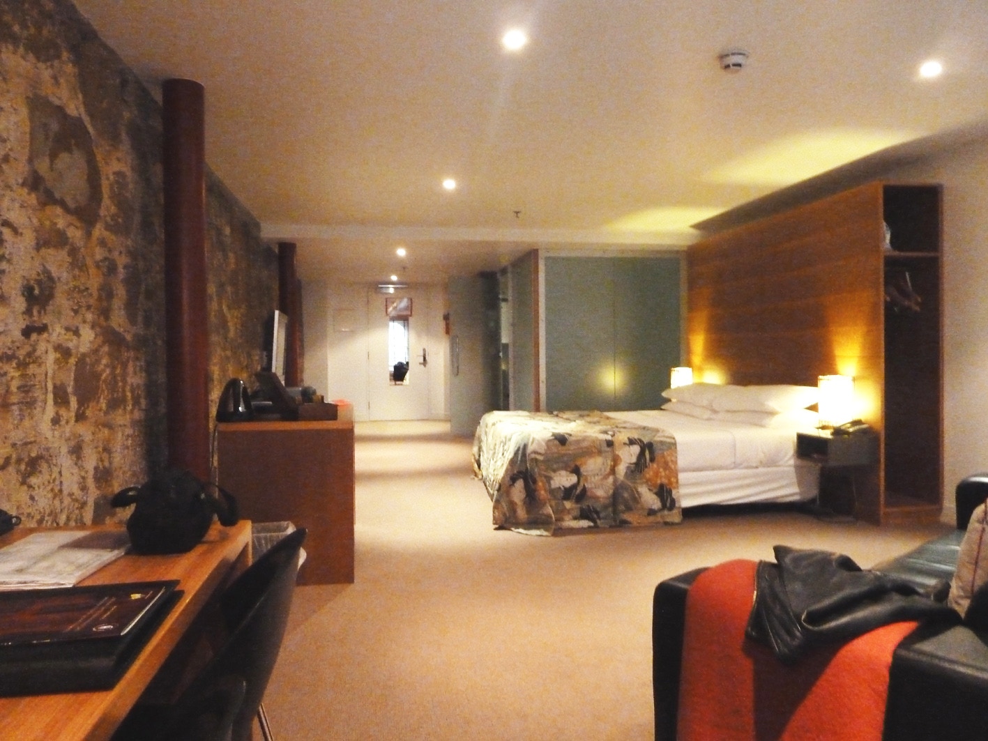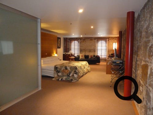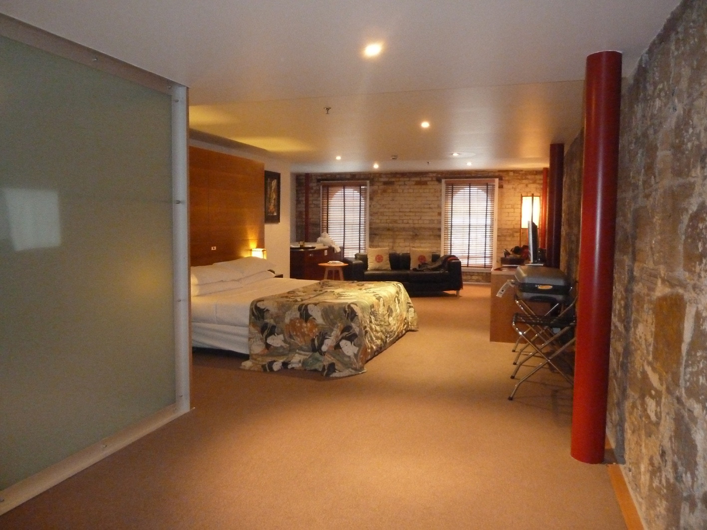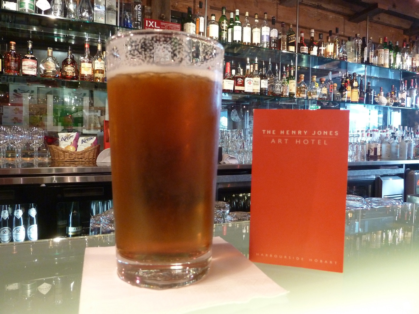 The Henry Jones Art Hotel, Hobart, Tasmania. An excellent hotel, showing the huge room, bathroom and a pint of Golden, in the bar