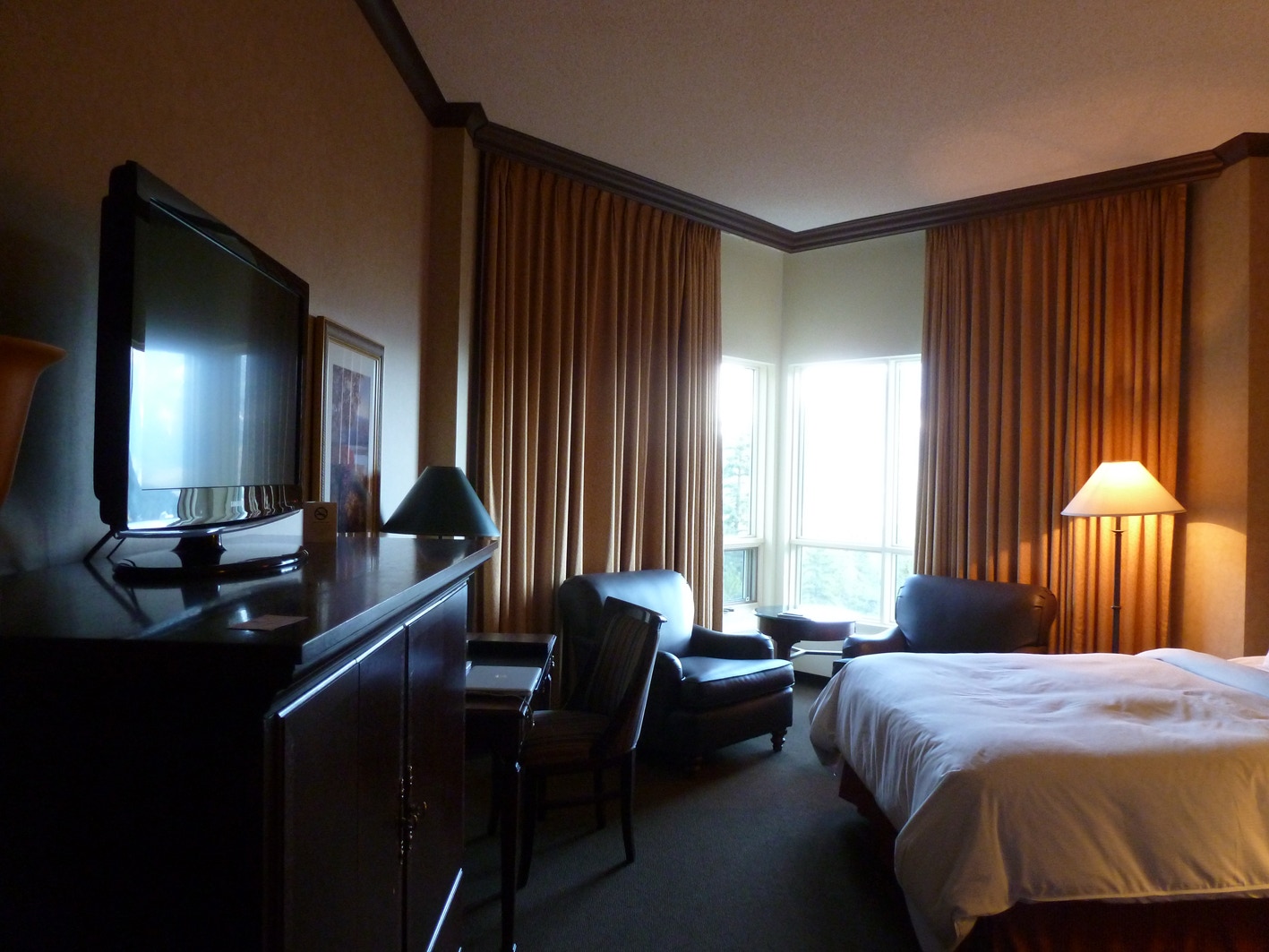 The really excellent Rimrock Resort hotel in Banff, an executive room and the bar area