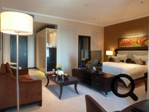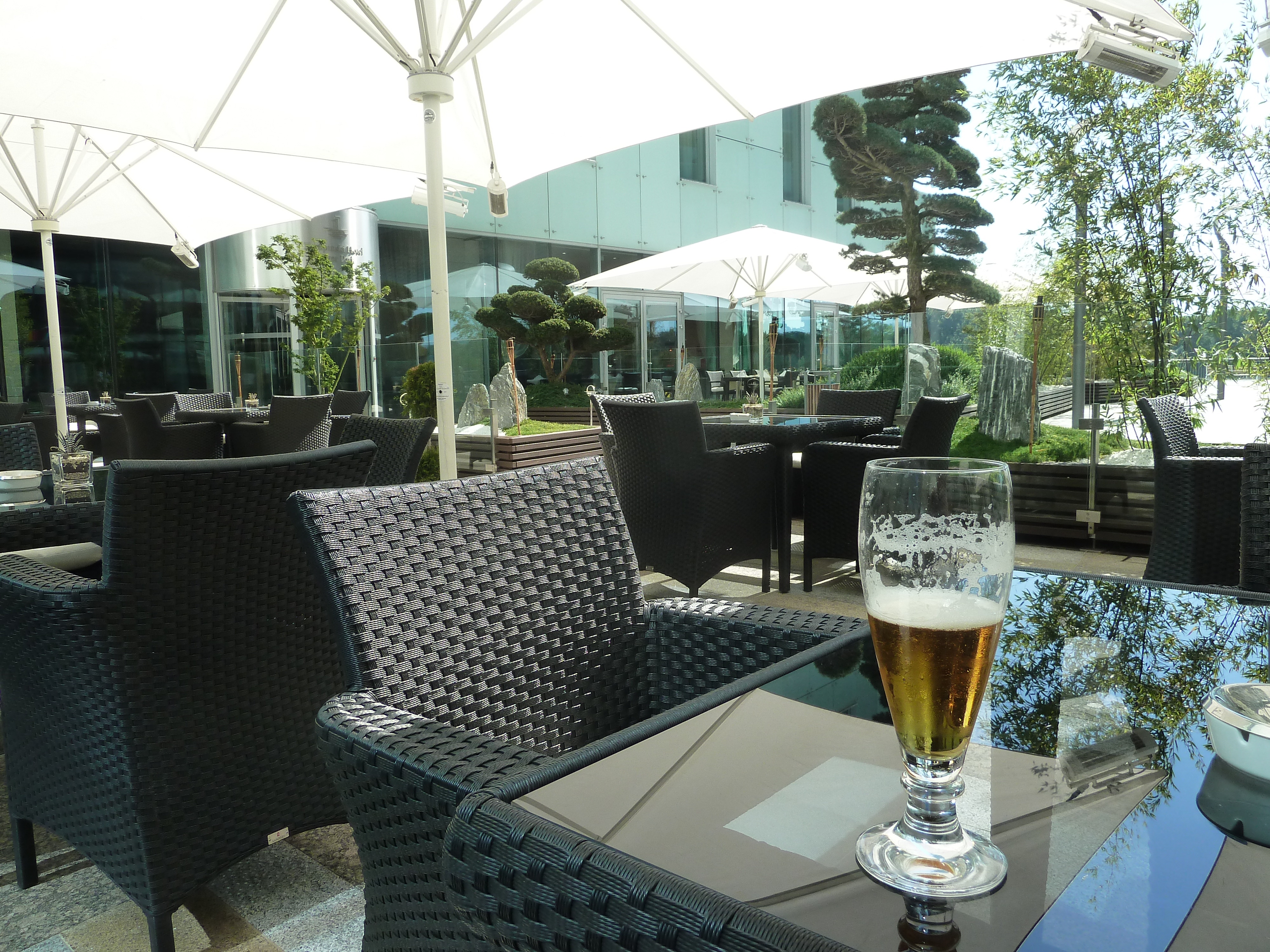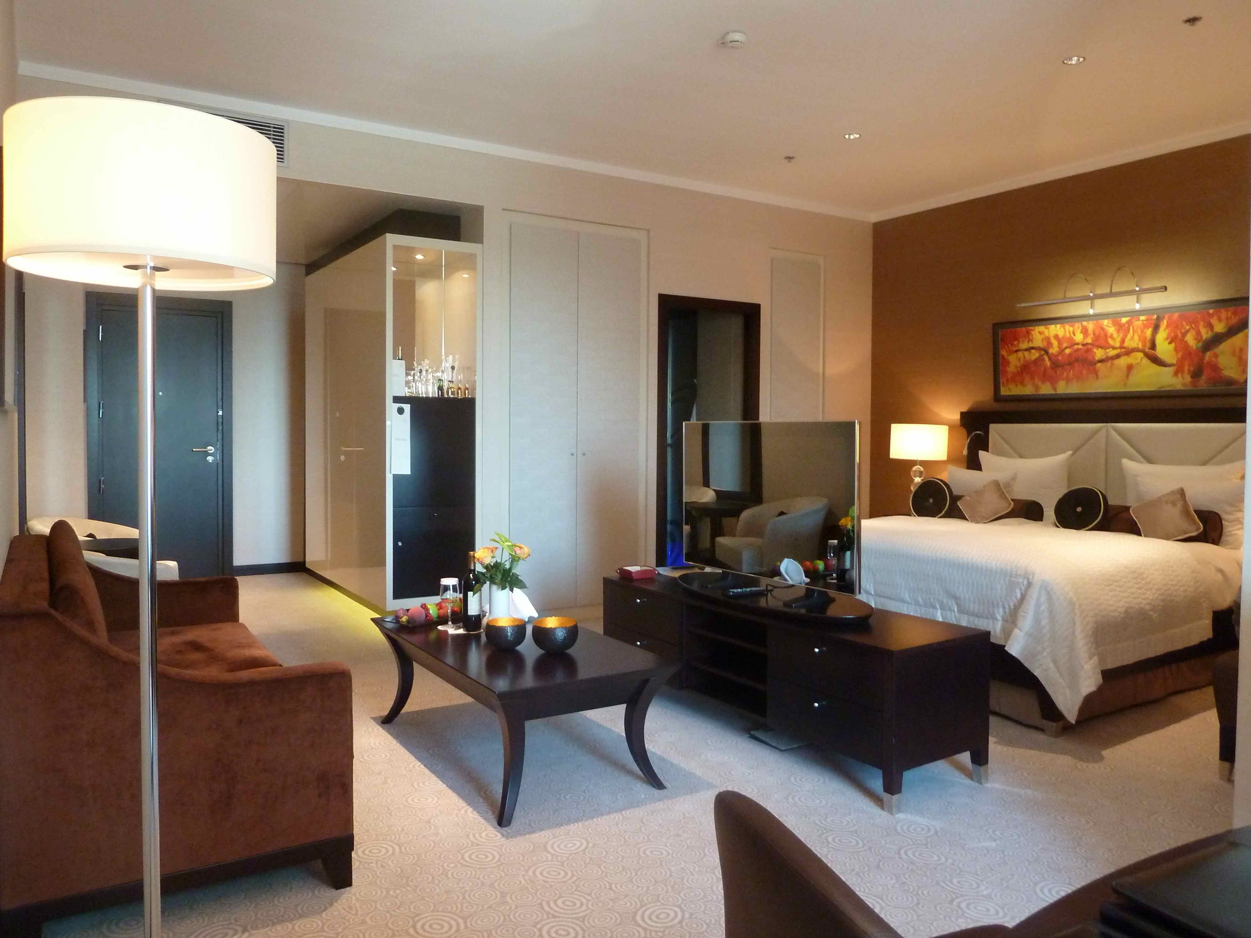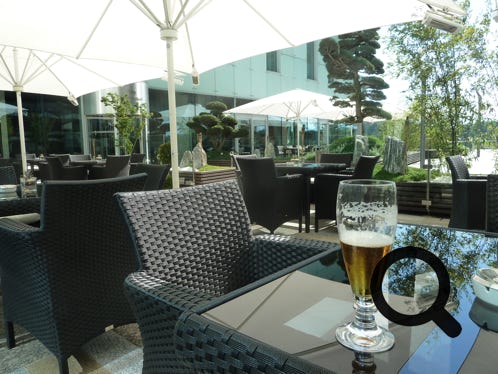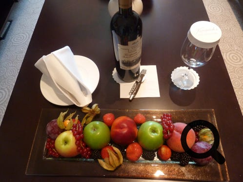The Kempinski Hotel, Bratislava. The room, complimentary fruit and the outside bar area. A brilliant hotel. Excellent.