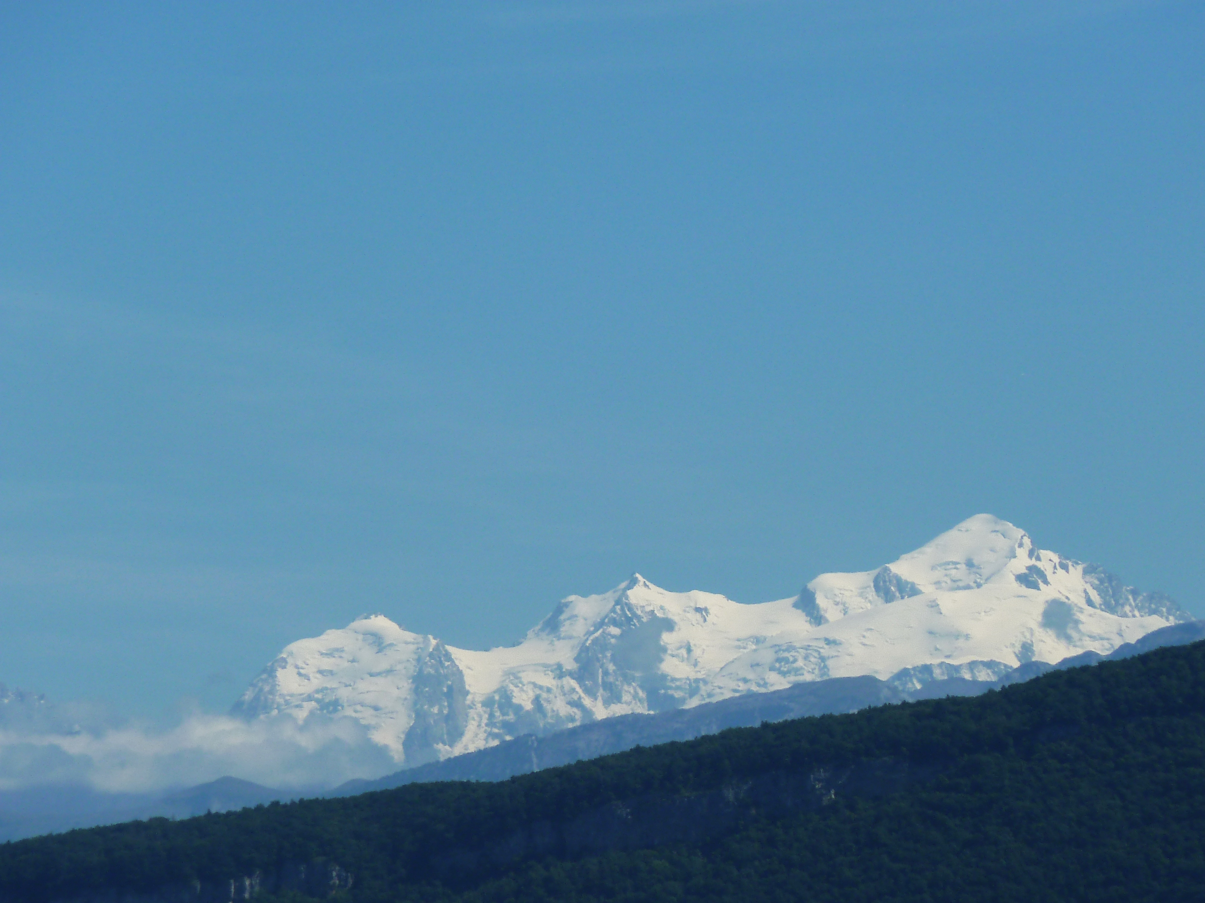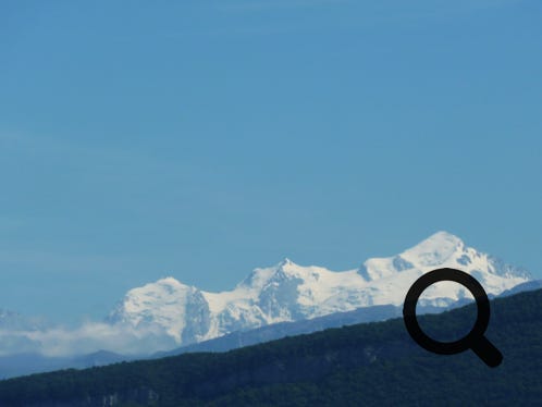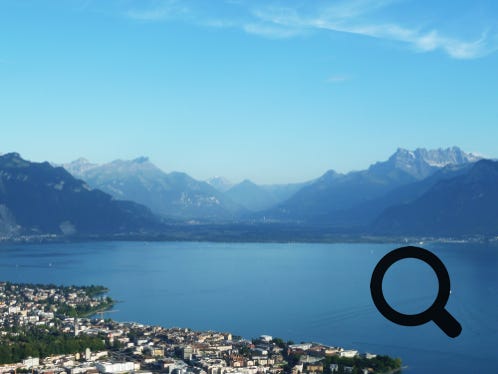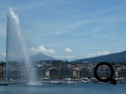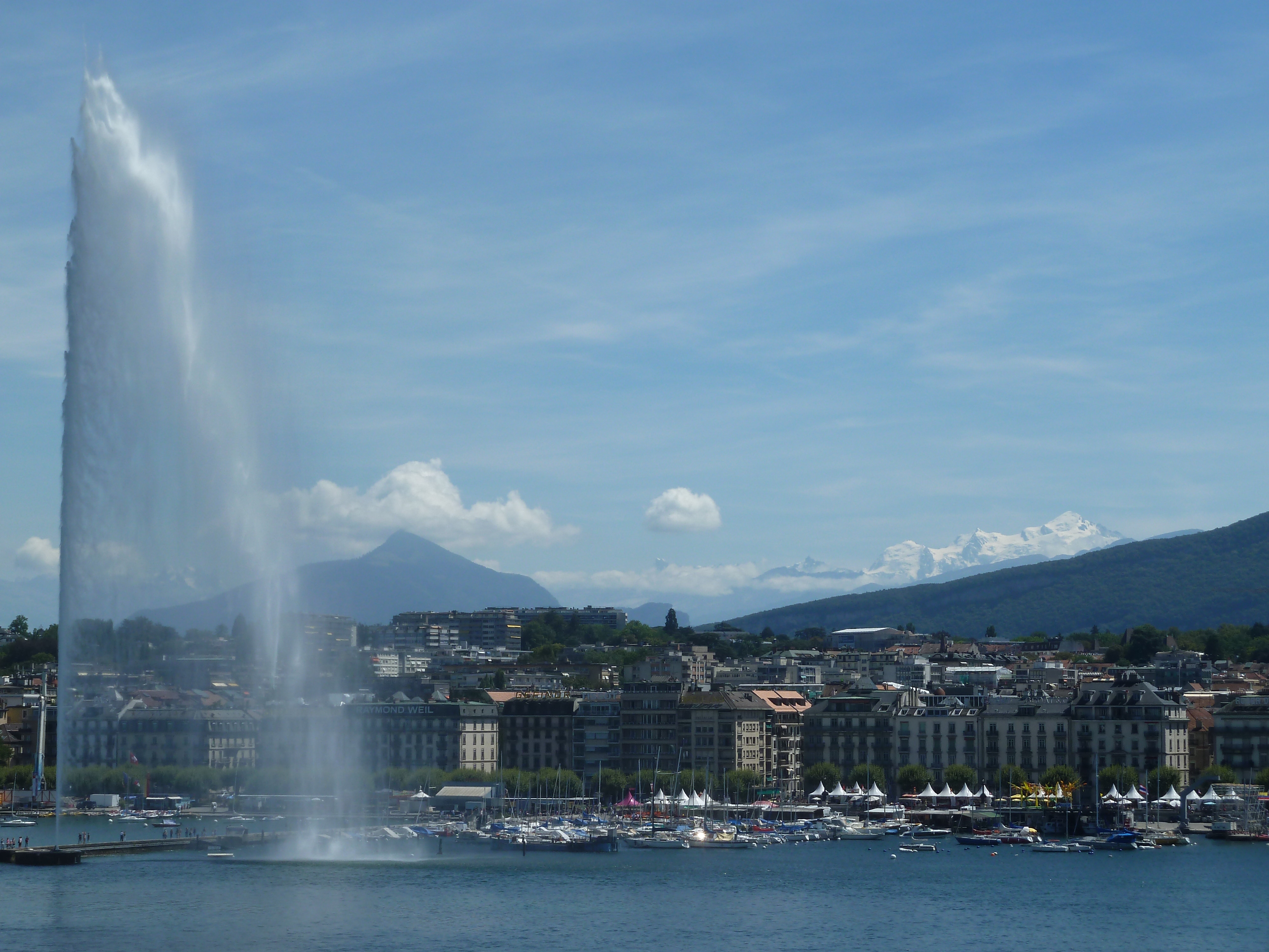 Geneva, the Jet D’Eau and snow-capped peaks in the distance