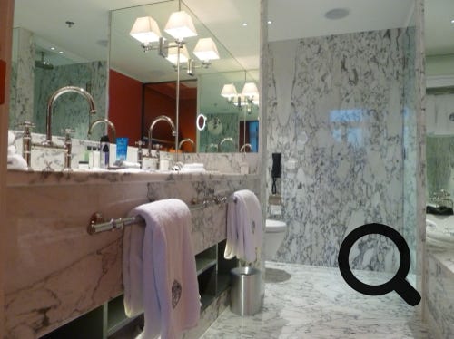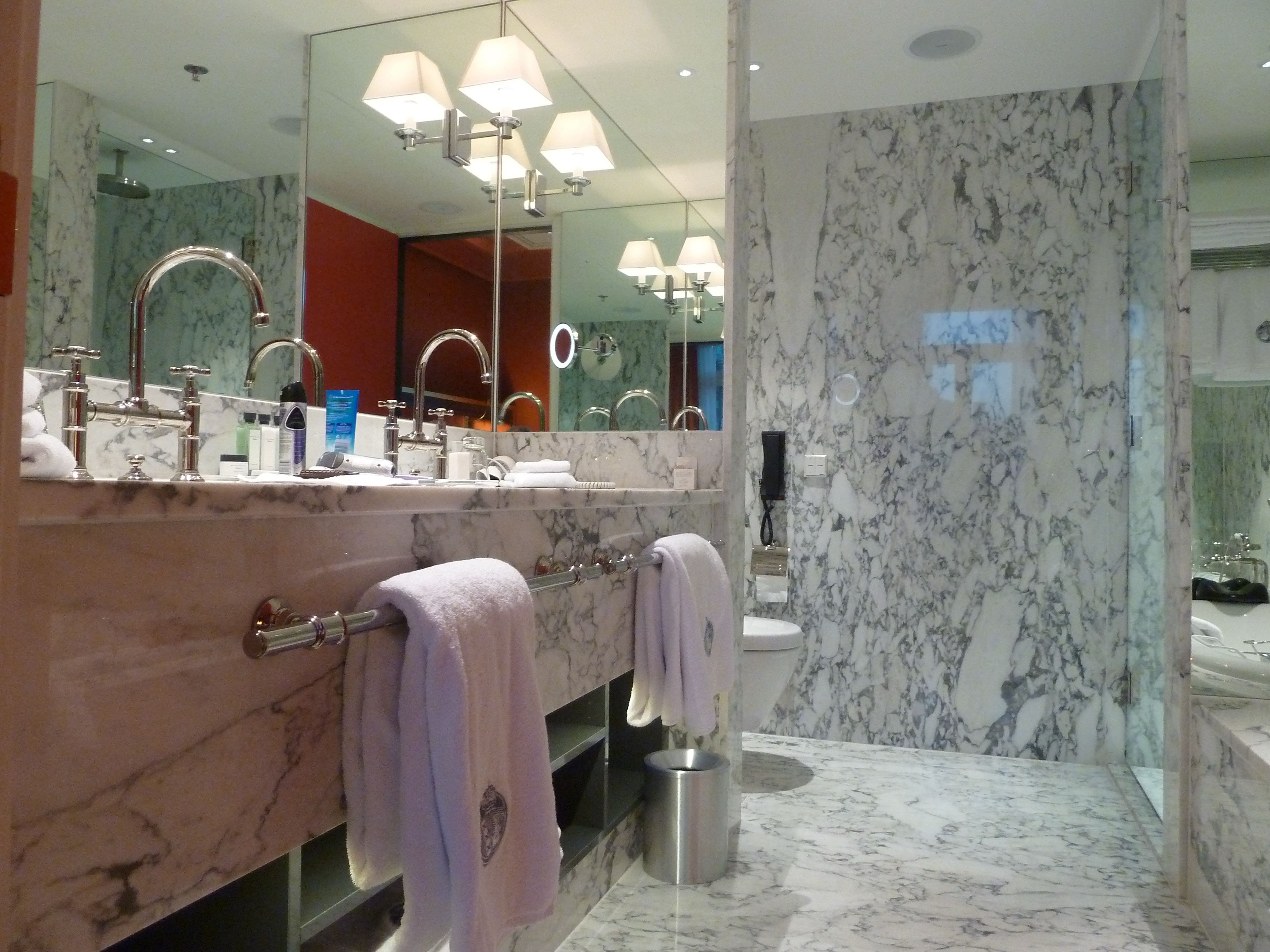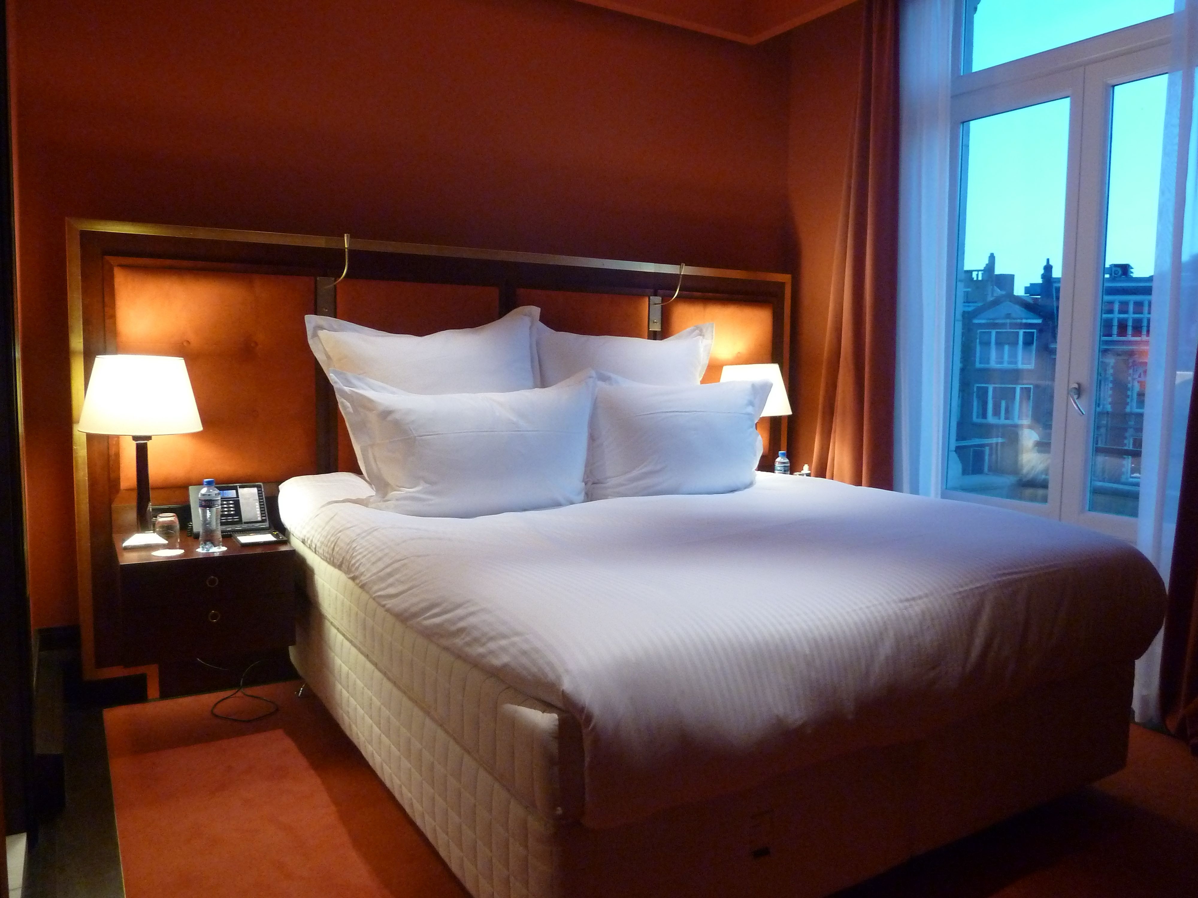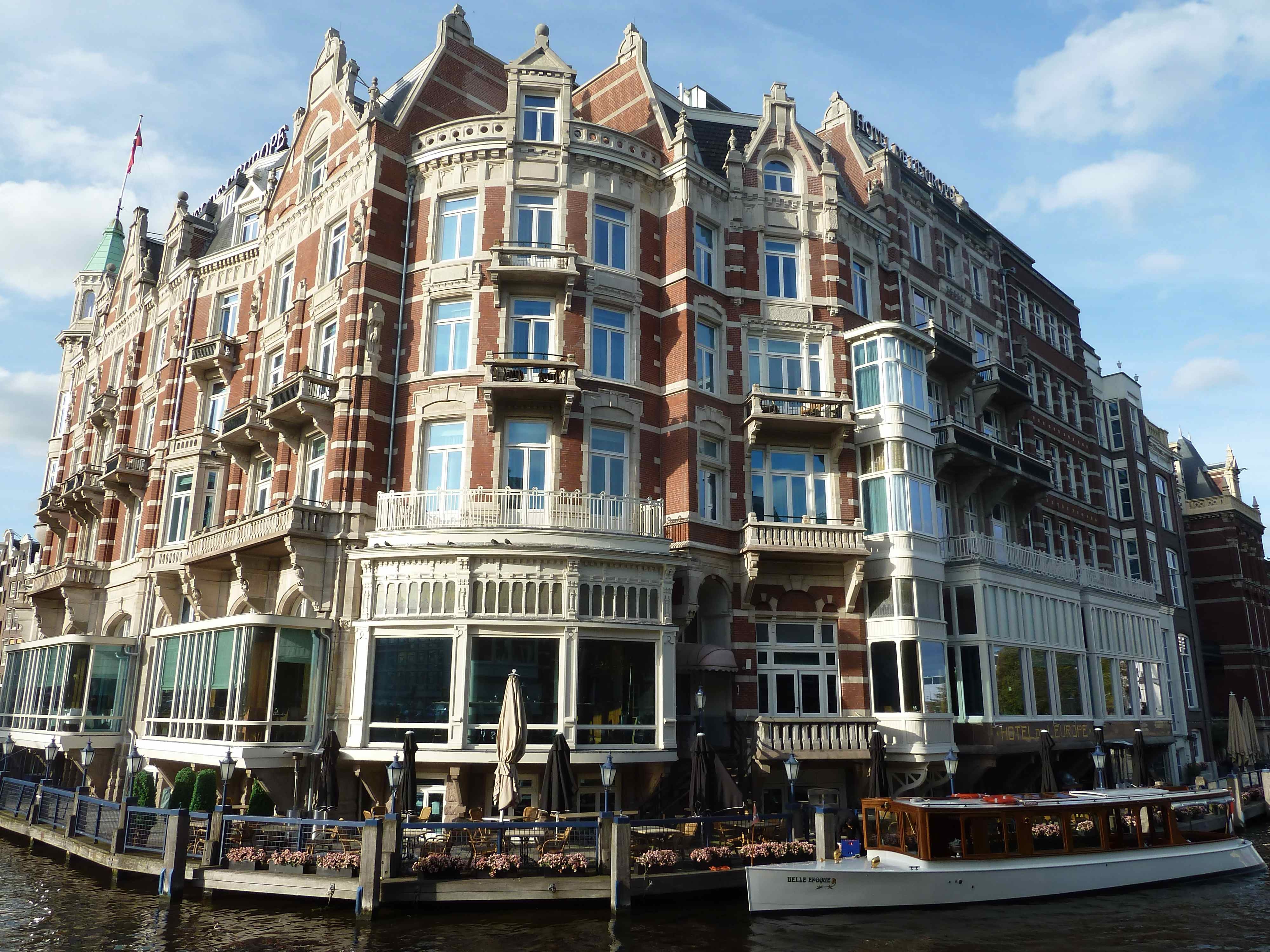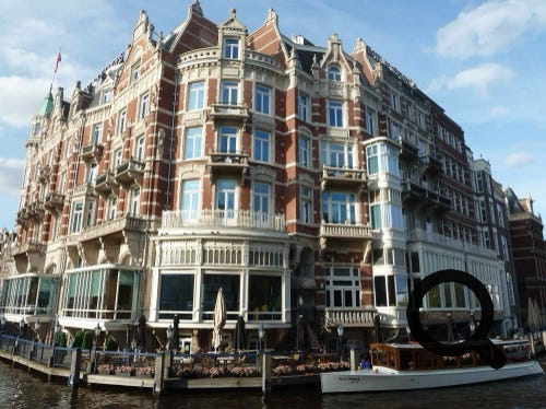 The excellent Hotel De L’Europe in Amsterdam, showing the bedroom of the suite, the sitting room and luxury bathroom