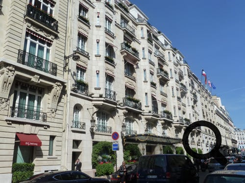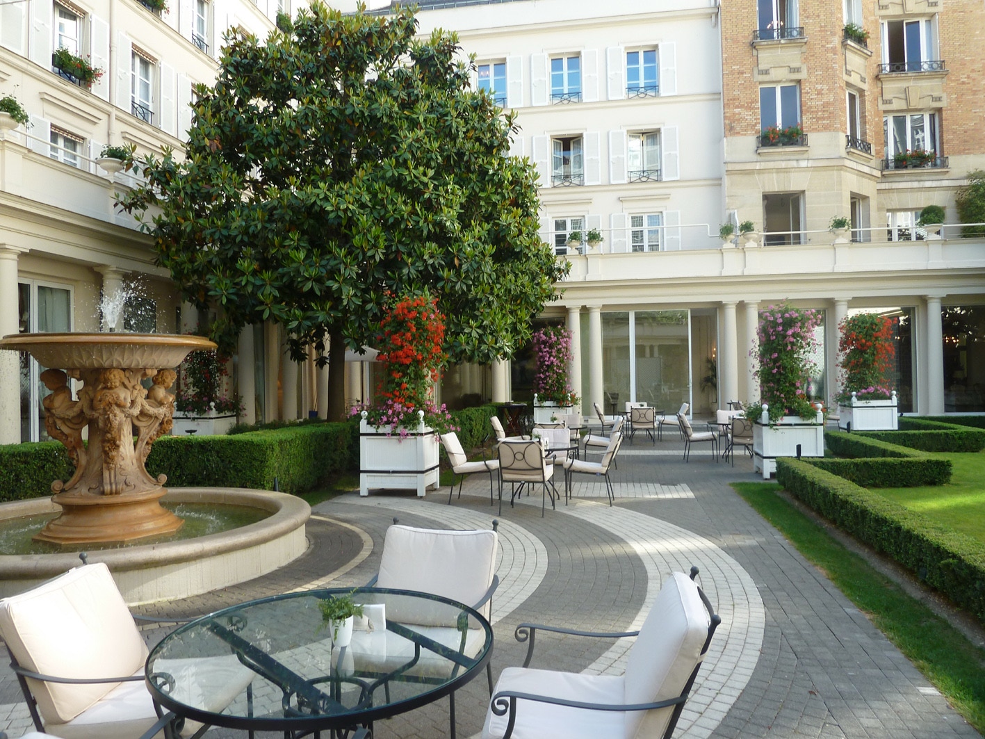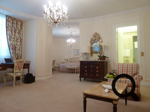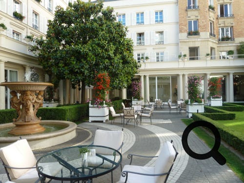 A deluxe junior suite at the Hotel Le Bristol, in Paris, with a lovely garden bar area