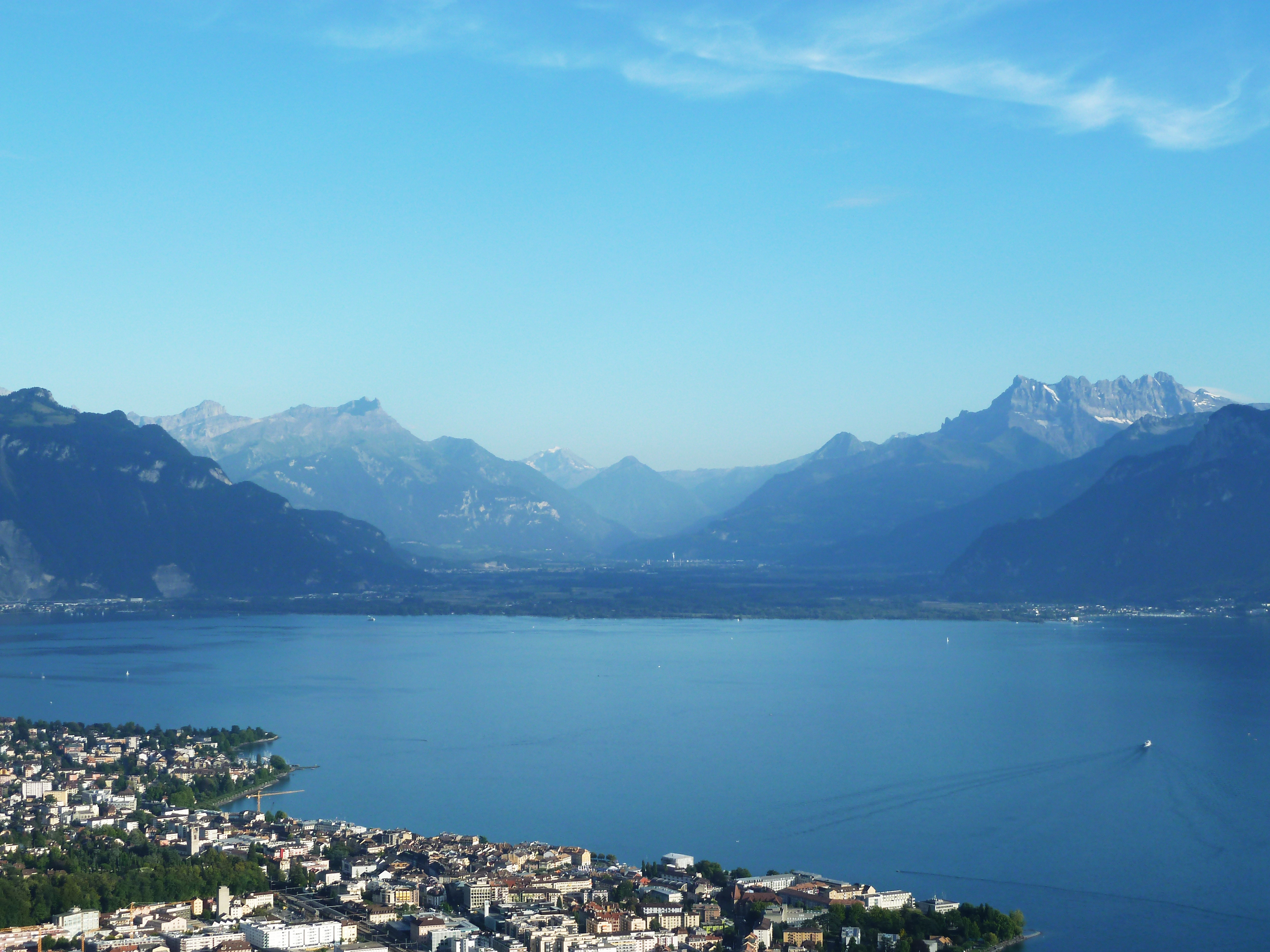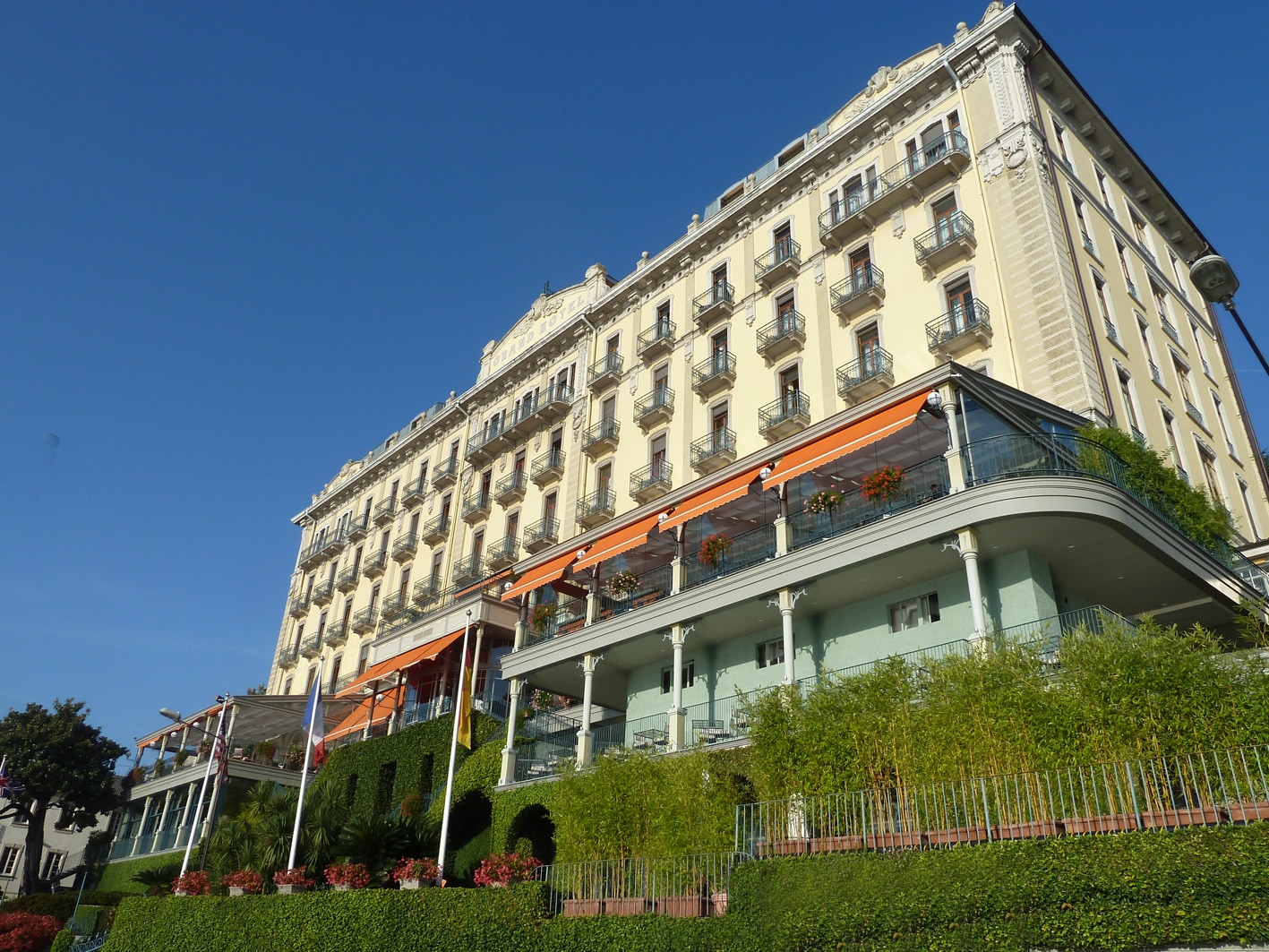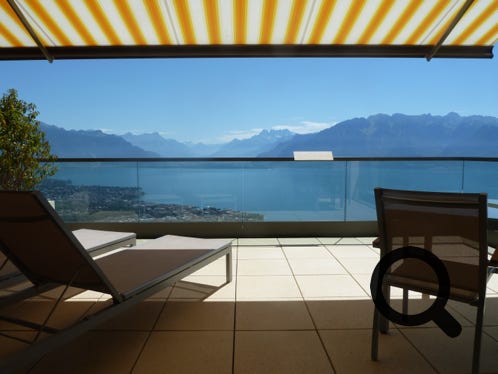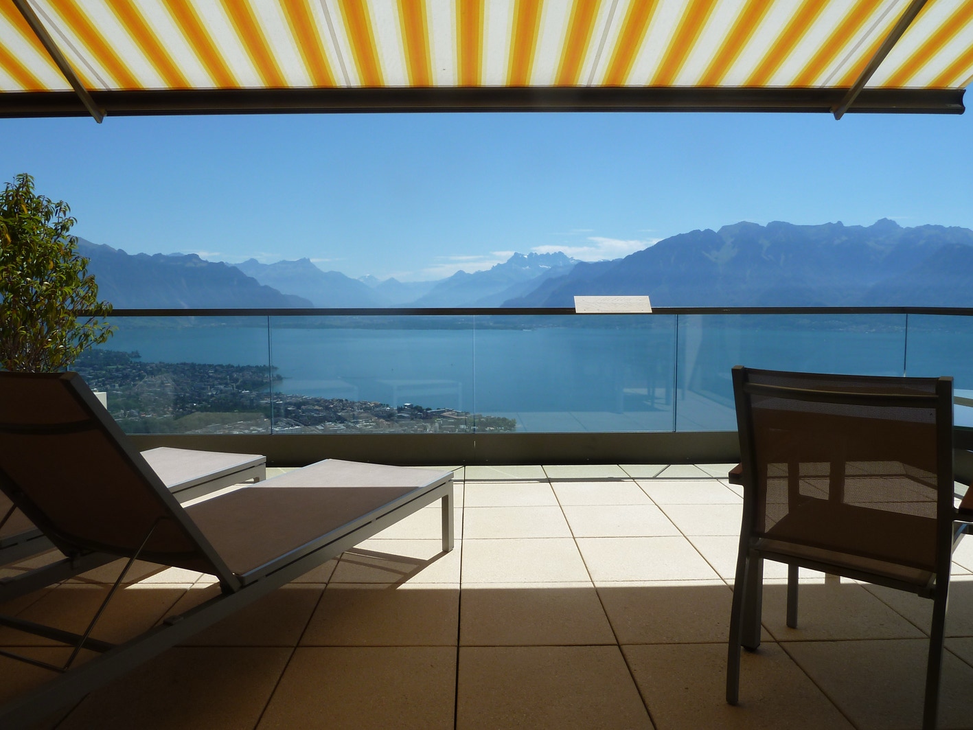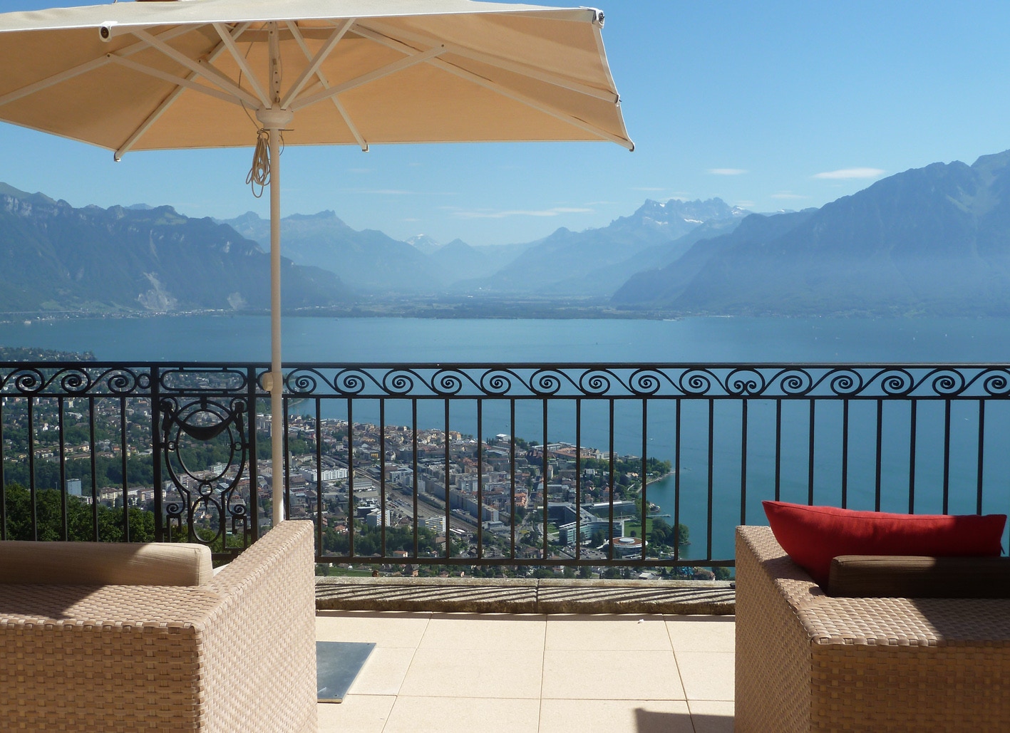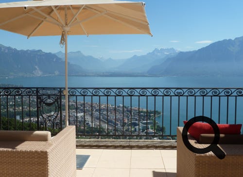 The Mirador Kempinski Hotel, above Lake Geneva, the room balcony and view from the bar