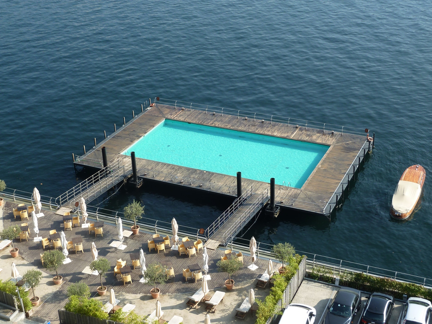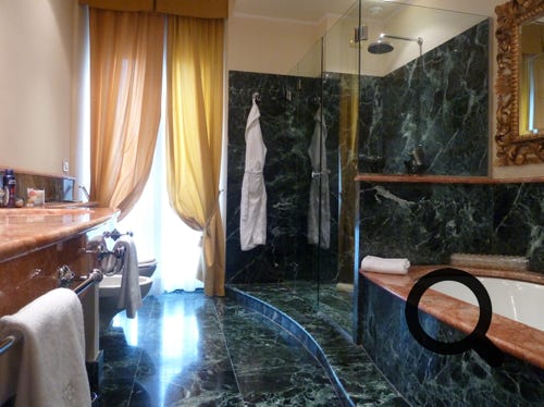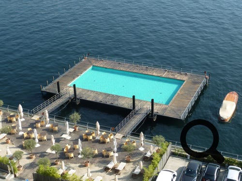 The Tremezzo, Lake Como, showing the room, bathroom and one of the two swimming pools
