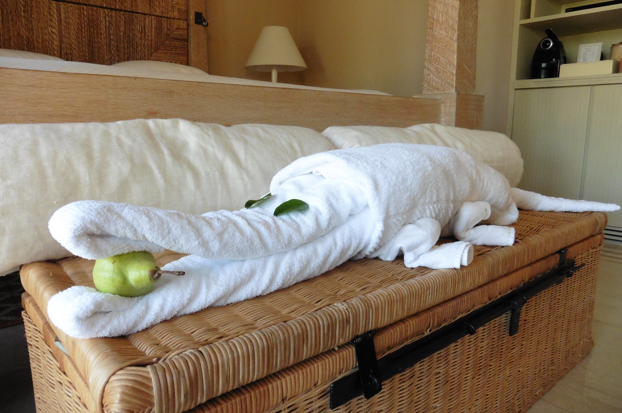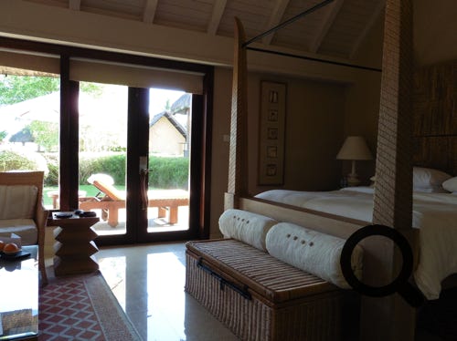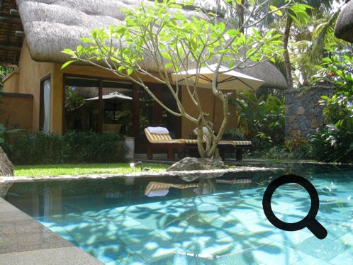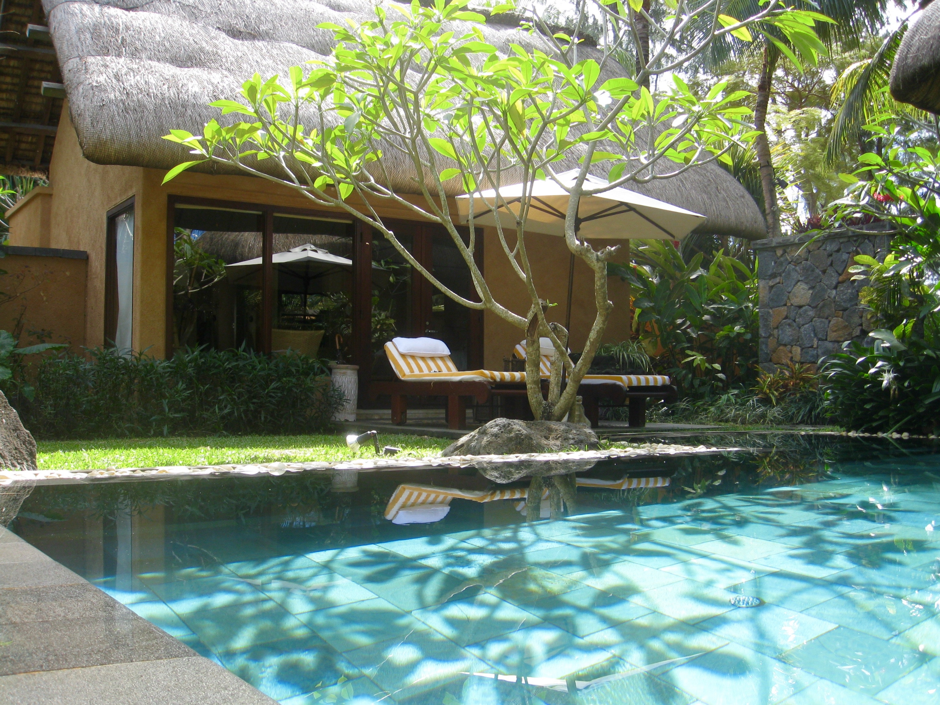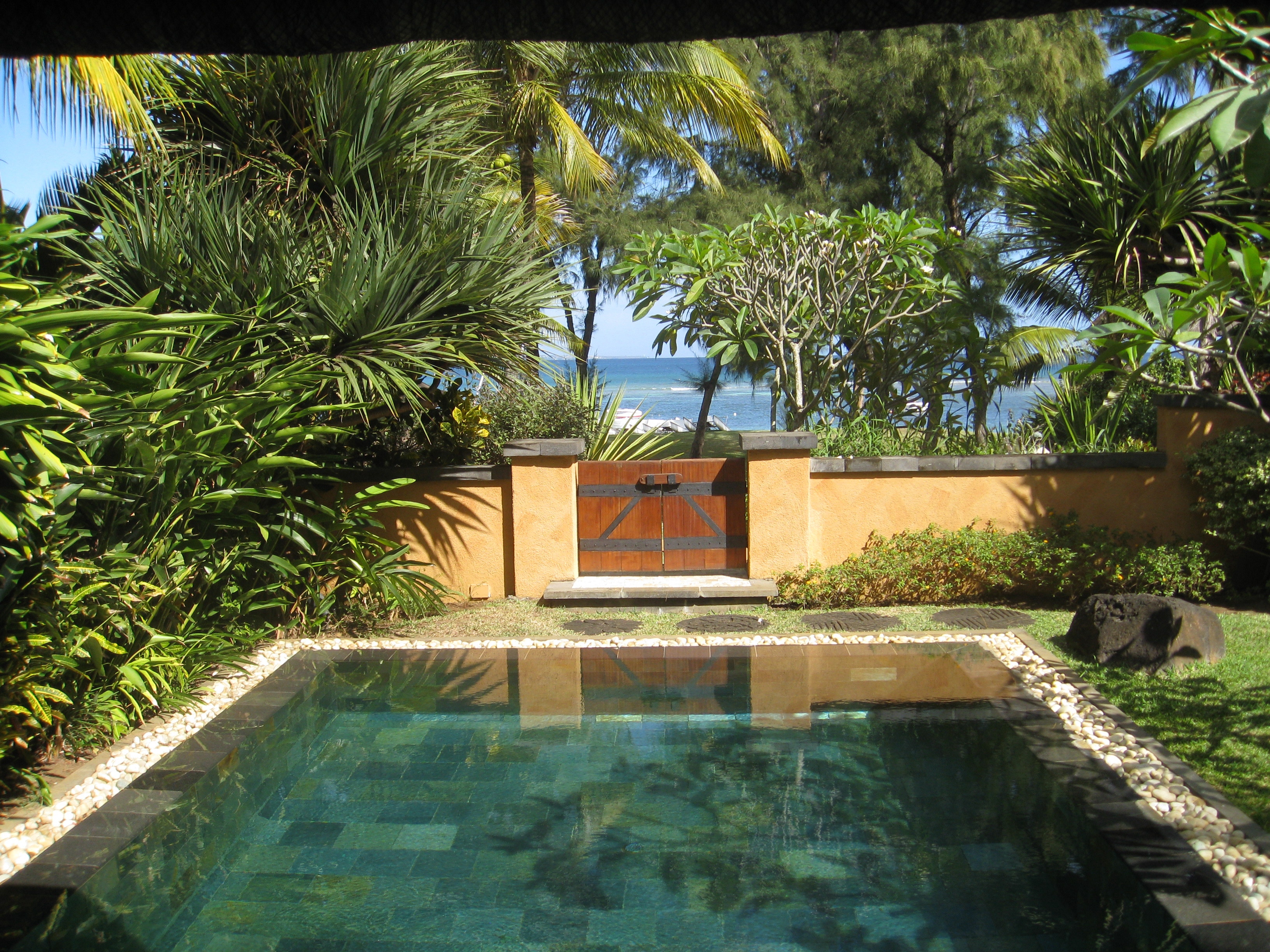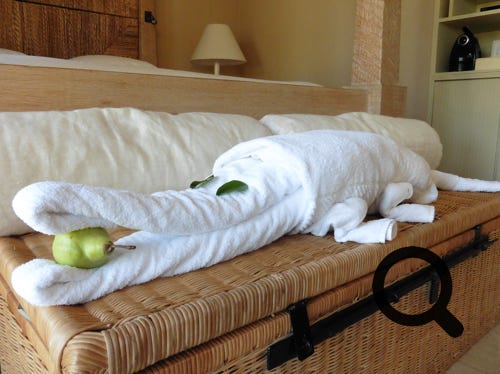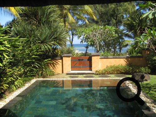 The truly wonderful Oberoi Hotel, Mauritius, pool-villa suite, the private infinity pool, part of the villa and towel art