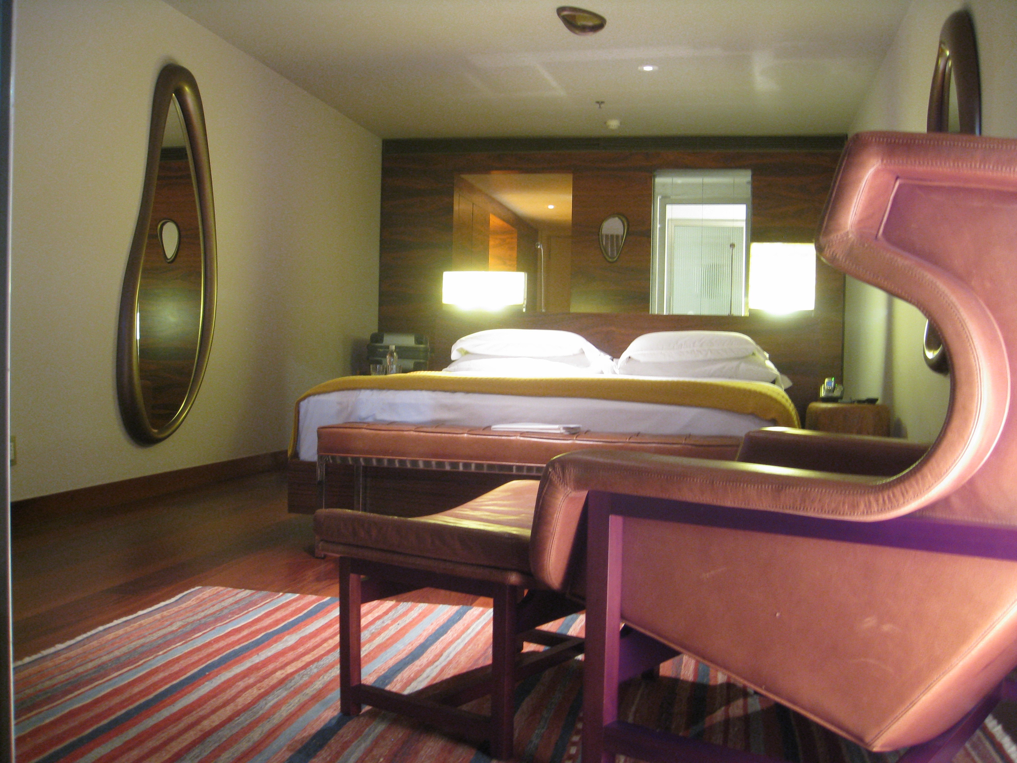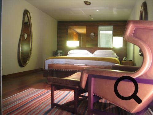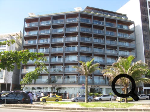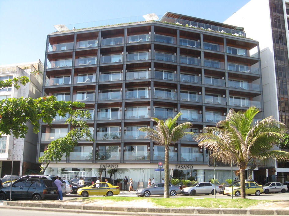 The exclusive Hotel Fasano, on Ipanema beach, showing a room and the view from the balcony at the front of the hotel