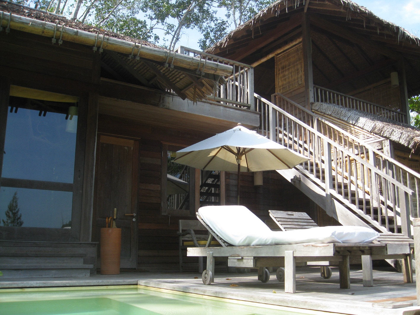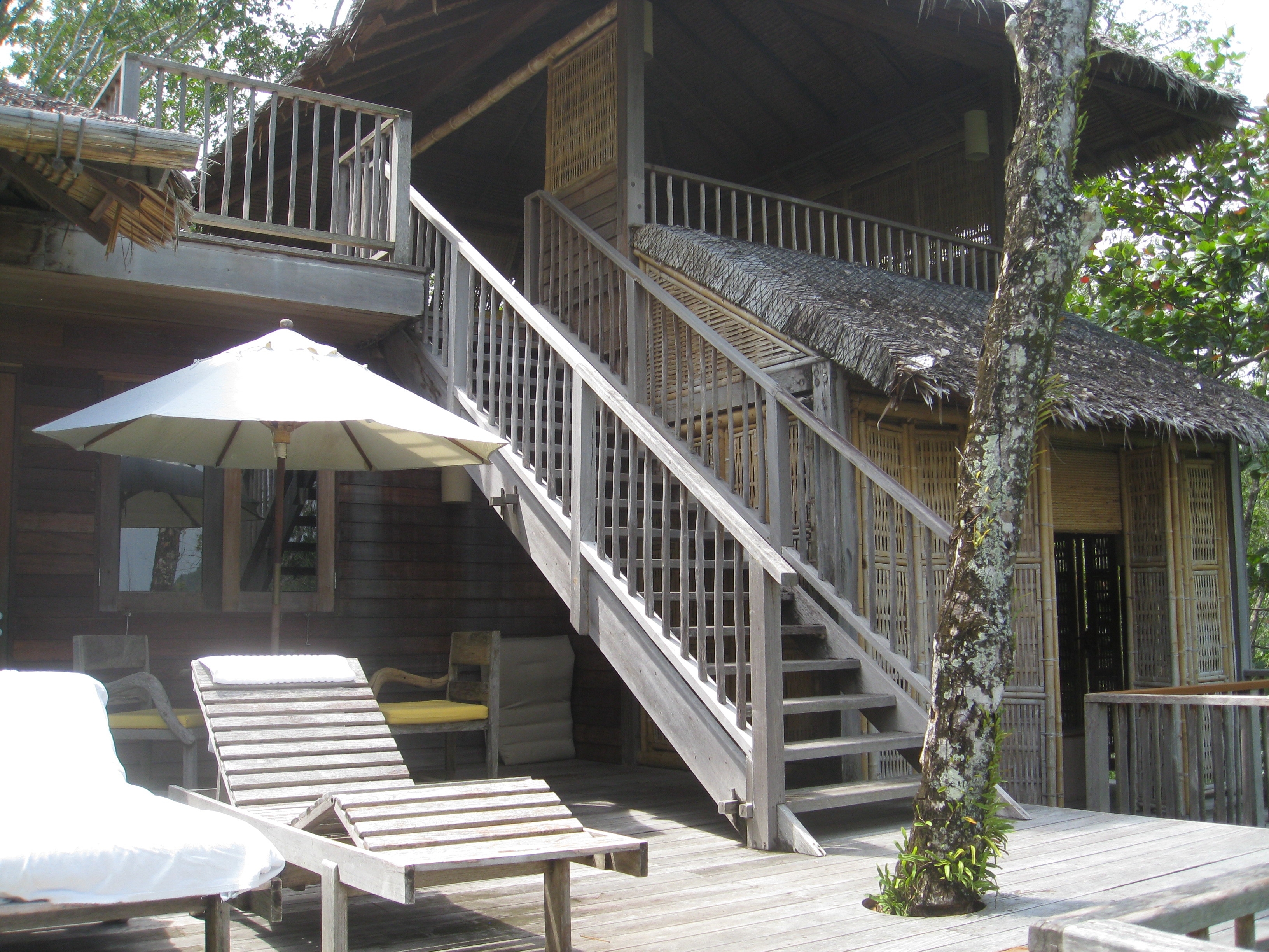 The stairs to the top floor day-room in the private villa, part of the top floor, the view from there and the local wildlife