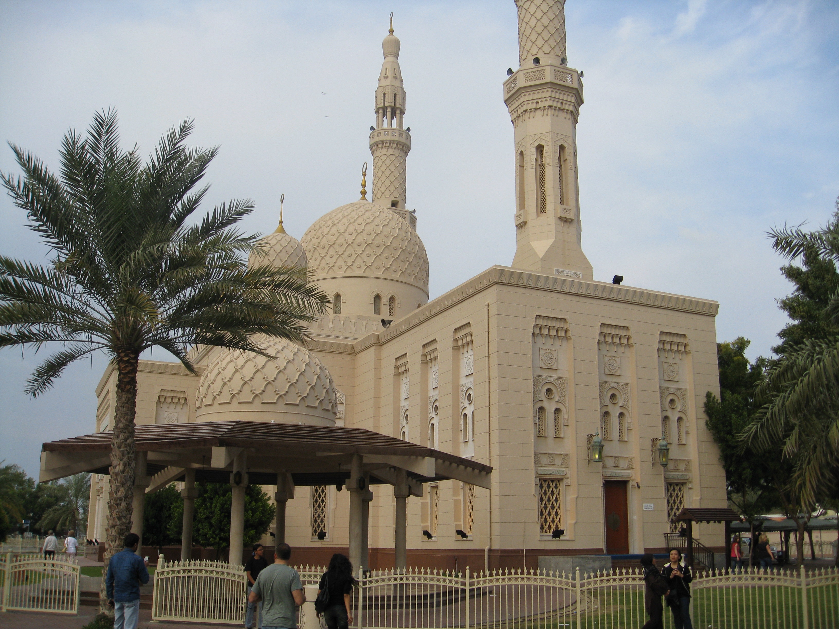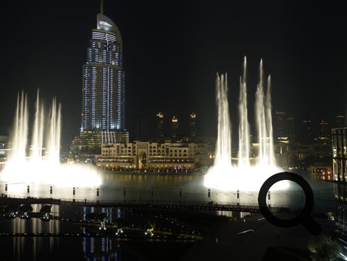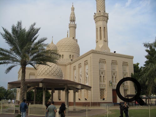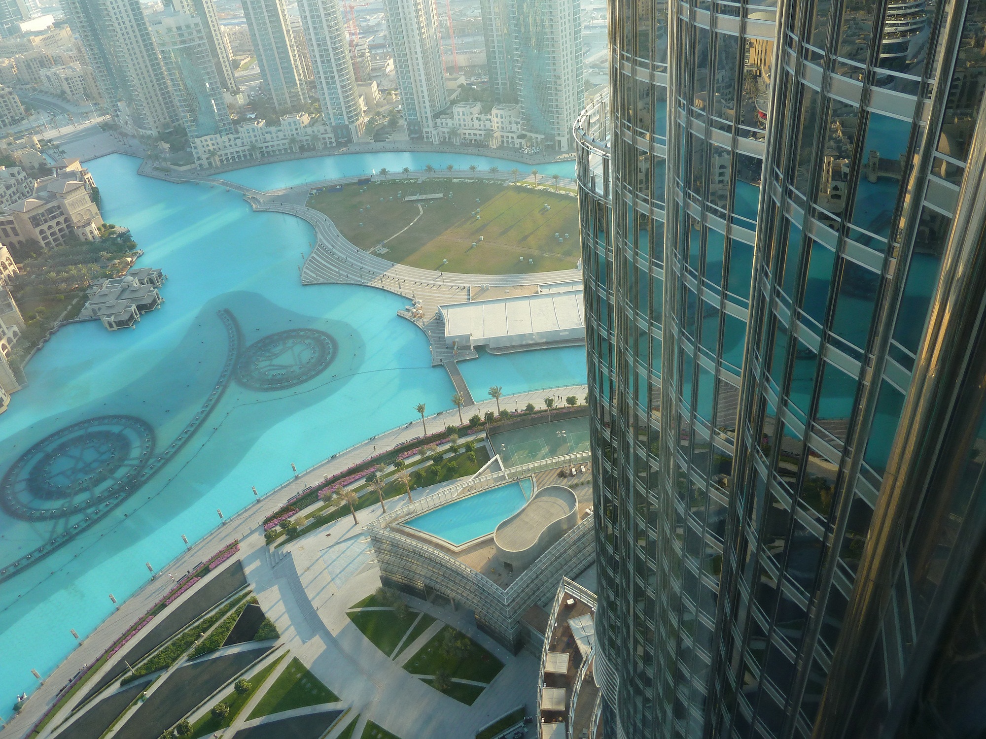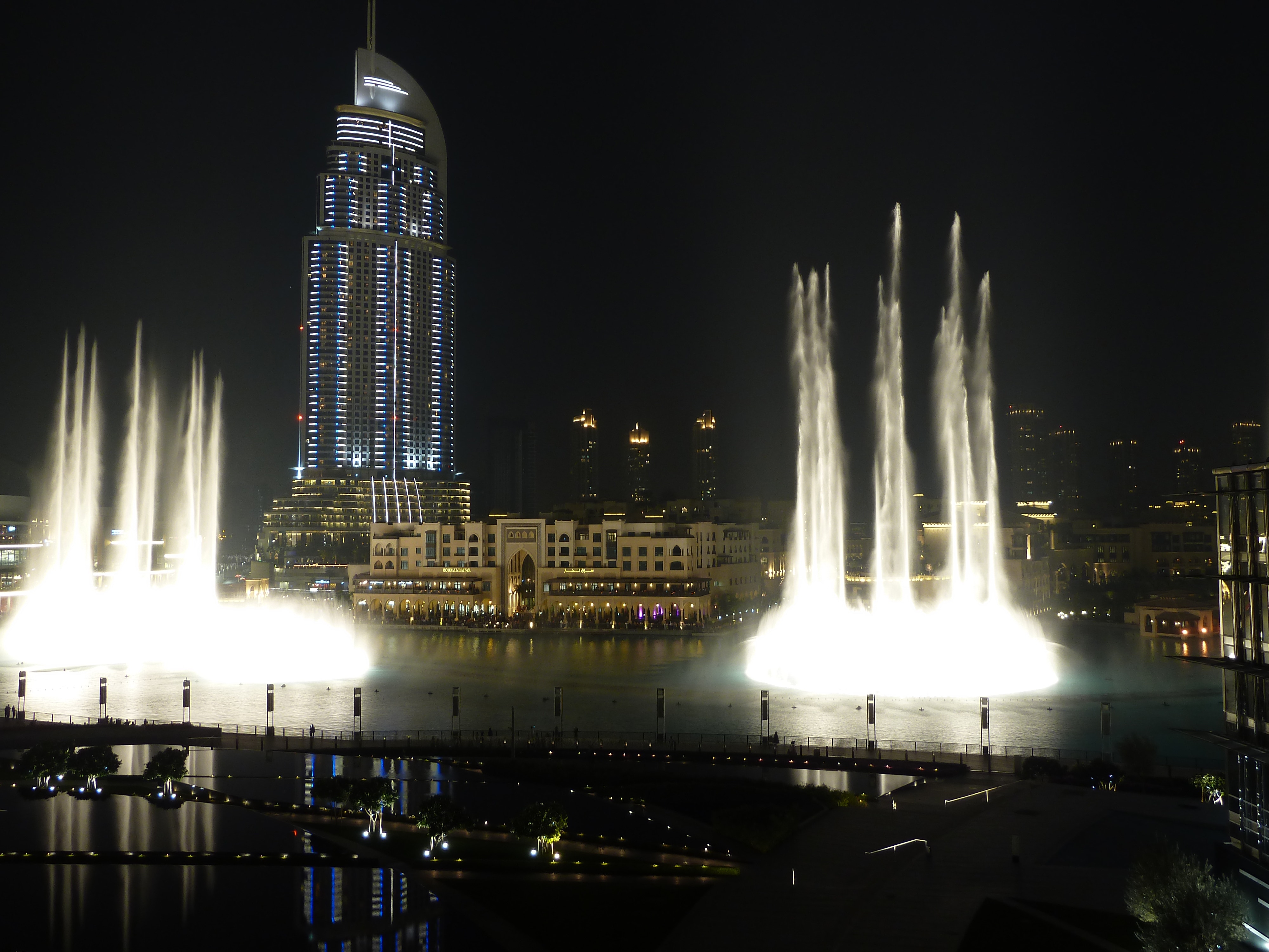 The Dubai Fountain, viewed from the Armani Hotel bar, one of many mosques, the Burj Khalifa viewed from The Address Hotel bar, and the Burj al Arab from the beach